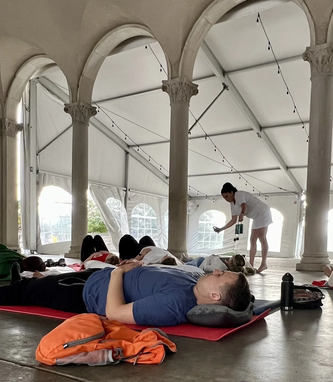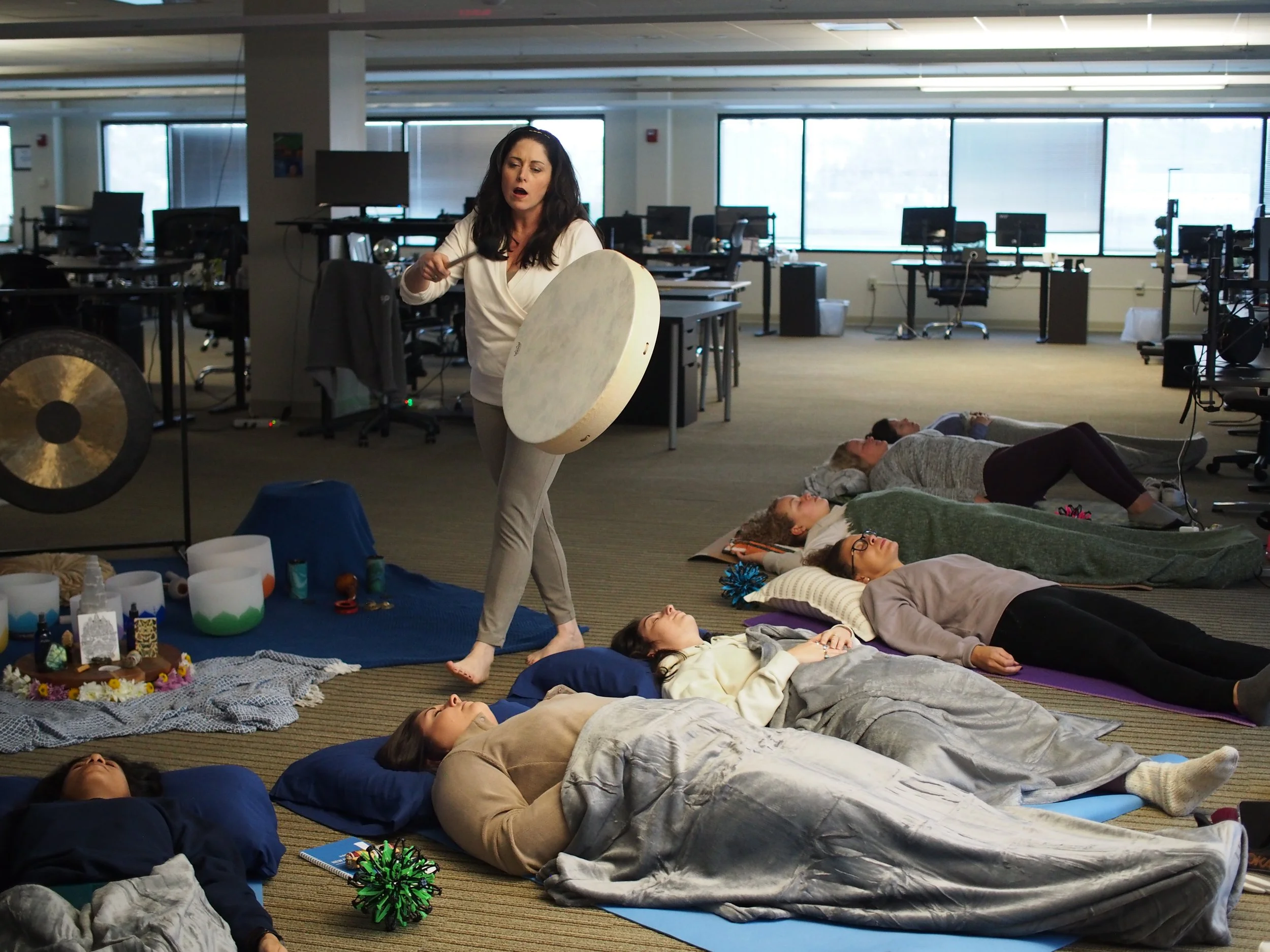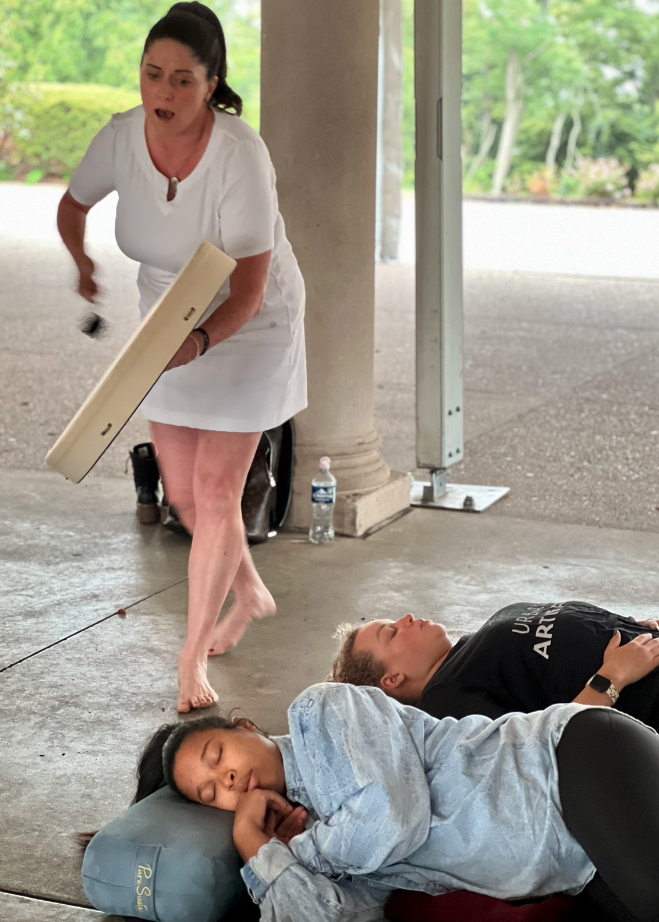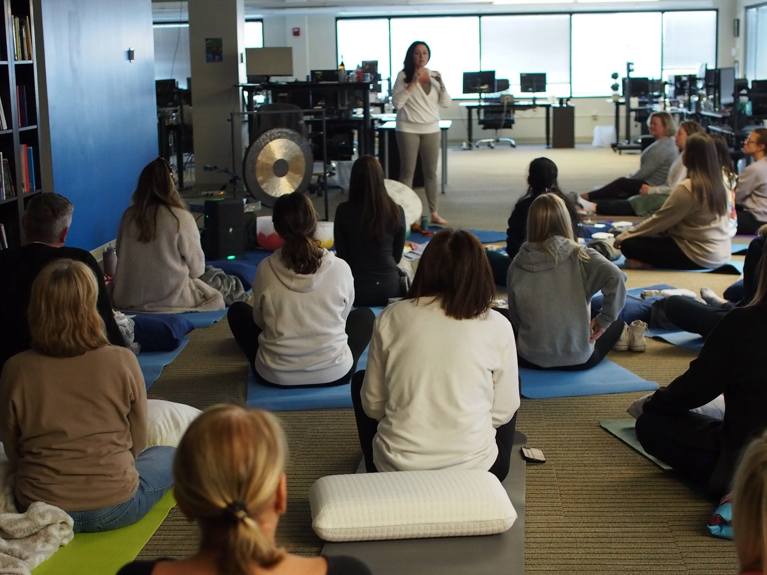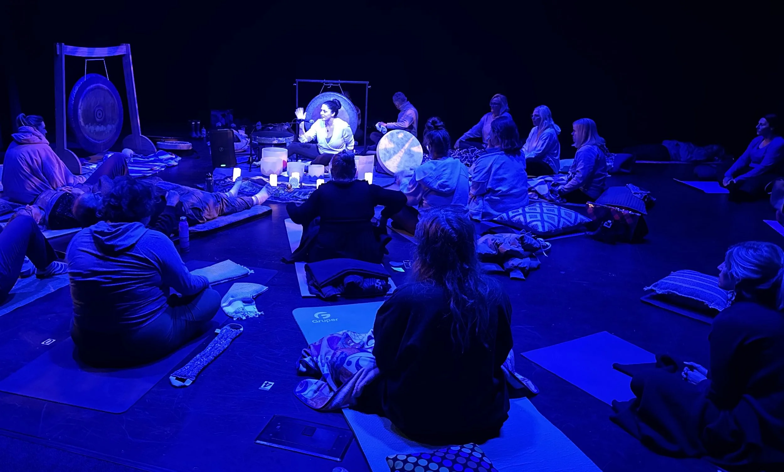 Come to class 15 minutes early to get cozy in the auditorium seats (if we are in the theater, sometimes there are rehearsals and we will be in other rooms) or bring your yoga mat and pillows to be closer to the instruments. This is your time to release the day and enter your sacred relaxation space.
